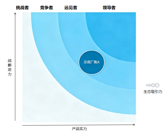 最終,我們不會(huì)簡(jiǎn)單排出123名,而是繪制出"引力象限圖":X軸代表企業(yè)當(dāng)前的產(chǎn)品實(shí)力,而Y軸則代表企業(yè)當(dāng)前產(chǎn)品戰(zhàn)略,圓圈大小則代表生態(tài)吸引力。同時(shí)引力象限被劃分為四個(gè)區(qū)域——領(lǐng)航者、遠(yuǎn)見(jiàn)者、競(jìng)爭(zhēng)者、挑戰(zhàn)者。這種二維定位比線性排名更能反映企業(yè)的真實(shí)處境。