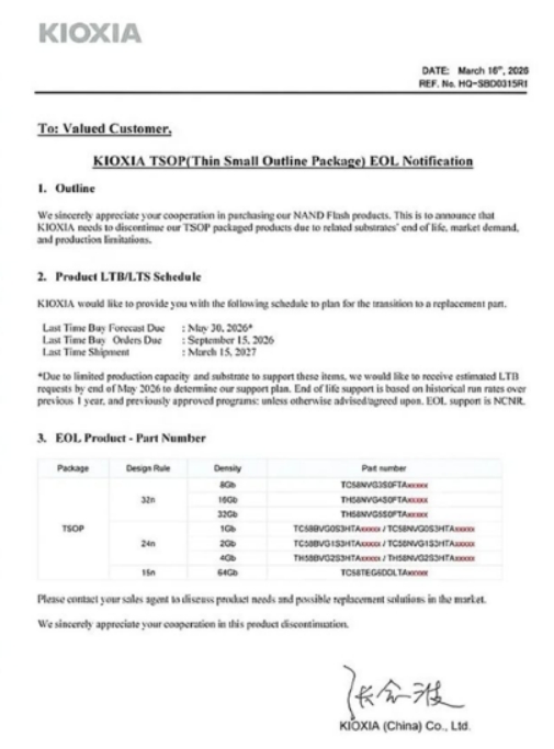 由于生產(chǎn)能力和基材限制,鎧俠表示,公司無(wú)法生產(chǎn)8Gb-64Gb的TSOP封裝產(chǎn)品。希望收到最后采購(gòu)預(yù)測(cè)(即客戶最后一次下單數(shù)量)期限為2026年5月30日,以確定鎧俠的支持計(jì)劃。最后采購(gòu)訂單截止日為2026年9月15日,最后出貨時(shí)間為2027年3月15日。