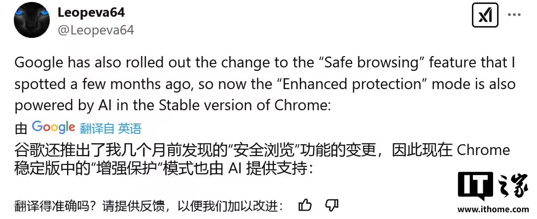 IT之家 2 月 17 日消息,消息源 @Leopeva64 昨日(2 月 16 日)在 X 平臺發(fā)布推文,稱在經(jīng)過 3 個月的 Canary 頻道測試后,谷歌 Chrome 瀏覽器穩(wěn)定版已全平臺上線全新“增強(qiáng)保護(hù)”(Enhanced protection)功能,在現(xiàn)有功能基礎(chǔ)上,通過 AI 實(shí)時防護(hù)危險(xiǎn)網(wǎng)站、下載和擴(kuò)展程序等。